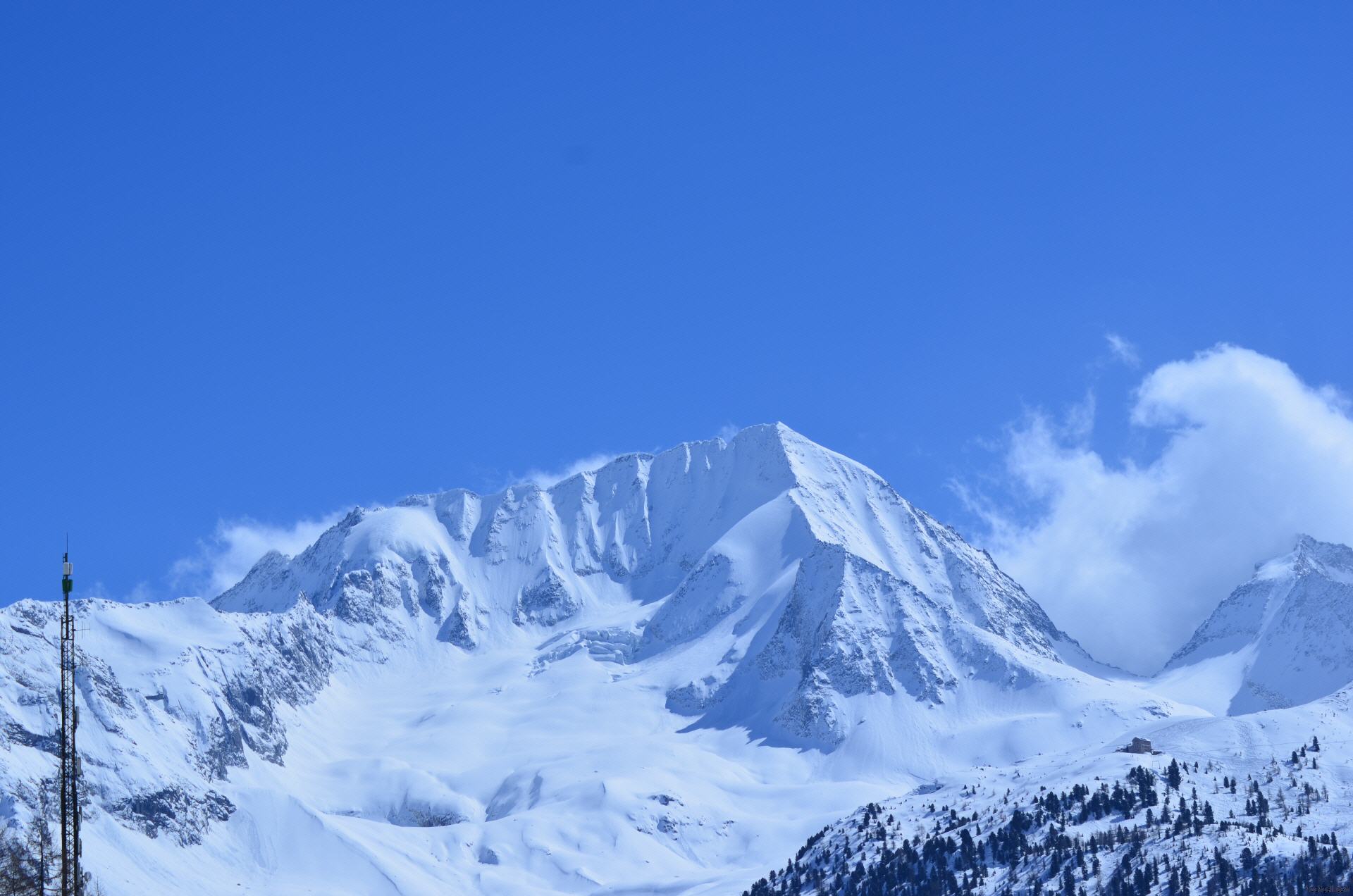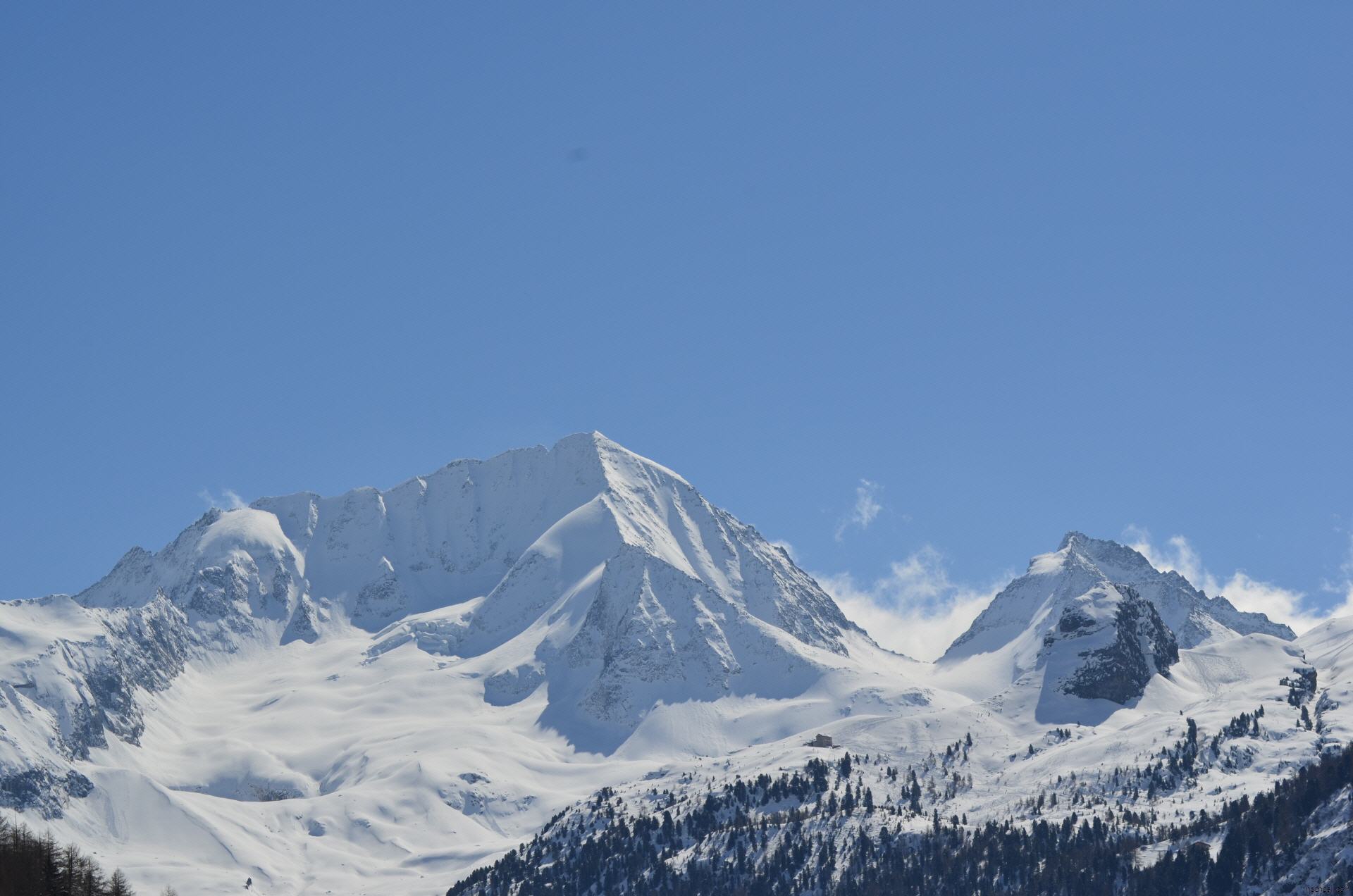 Das Bild zeigt den Gipfelaufbau des Hochgalls mit dem obersten Teil des Hochgallferners und dem Nordwestgrat vorne, der langen Firnschneide des Nordostgrates mittig. Aufnahmepunkt vom Arthur-Hartdegen-Weg.